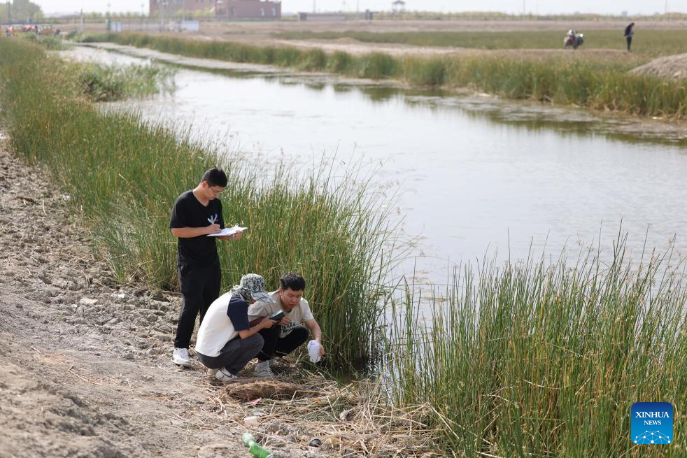 Team member Feng Chen (L) and Liu Yinghui check water quality of the Ulan Suhai Lake in Bayannur, north China's Inner Mongolia Autonomous Region, Sept. 15, 2023. (Xinhua/Wang Kaiyan)