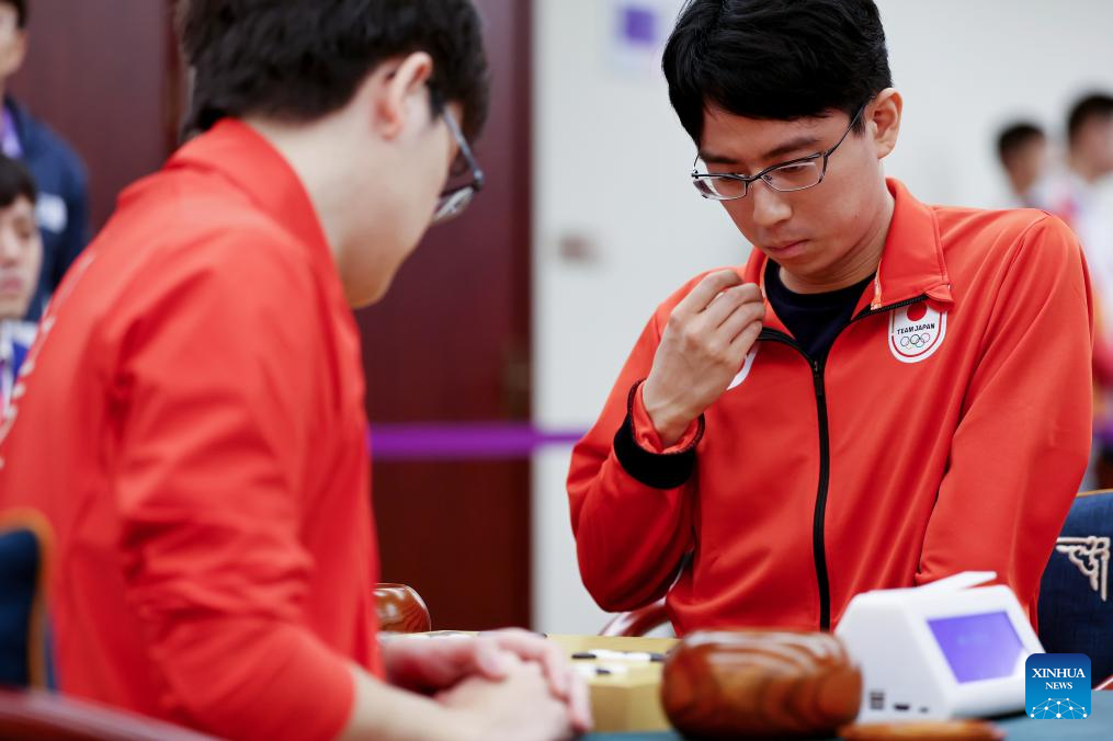 Ke Jie (L) of China competes against Ichiriki Ryo of Japan during the Men's Individual Semifinal of Go Chess at the 19th Asian Games in Hangzhou, east China's Zhejiang Province, Sept. 28, 2023. (Xinhua/Gong Bing)