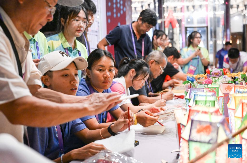 Members of different delegations experience traditional Chinese handicraft at the Asian Games Sub-village in Chun'an, east China's Zhejiang Province, Sept. 25, 2023. (Xinhua/Hu Huhu)