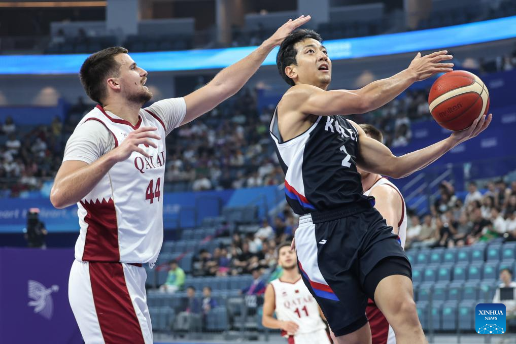 Guna RA (R) of South Korea goes for a layup during the Men's Preliminary Round Group D match of Basketball between South Korea and Qatar at the 19th Asian Games in Hangzhou, east China's Zhejiang Province, Sept. 28, 2023. (Xinhua/Pan Yulong)