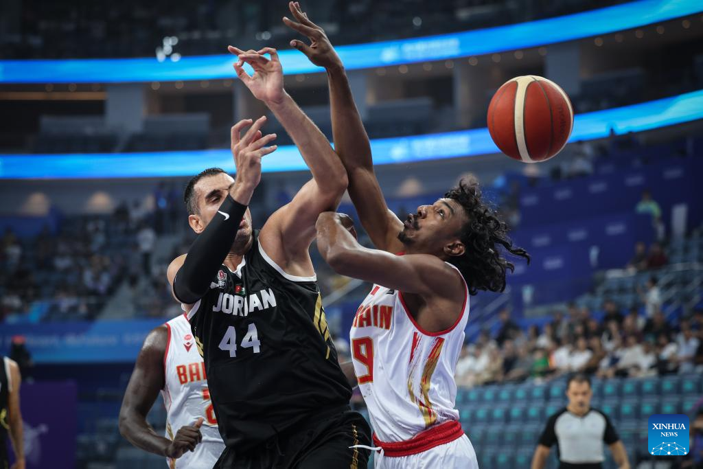 Ahmad Al Dwairi (L) of Jordan grabs rebound against Alwatheq Ali Sidahmed Alhassan of Bahrain during the Men's Preliminary Round Group C match of Basketball between Jordan and Bahrain at the 19th Asian Games in Hangzhou, east China's Zhejiang Province, Sept. 28, 2023. (Xinhua/Pan Yulong)