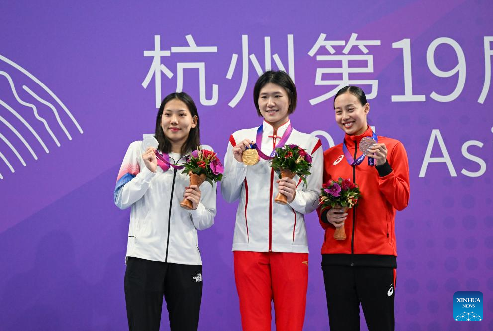 Gold Medalist Ye Shiwen (C) of China, Silver Medalist Kwon Sehyun (L) of South Korea and Bronze Medalist Imai Runa of Japan attend the awarding ceremony for Women's 200m Breaststroke of Swimming at the 19th Asian Games in Hangzhou, east China's Zhejiang Province, Sept. 28, 2023. (Xinhua/Xue Yuge)