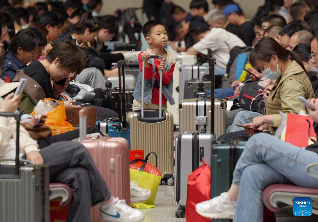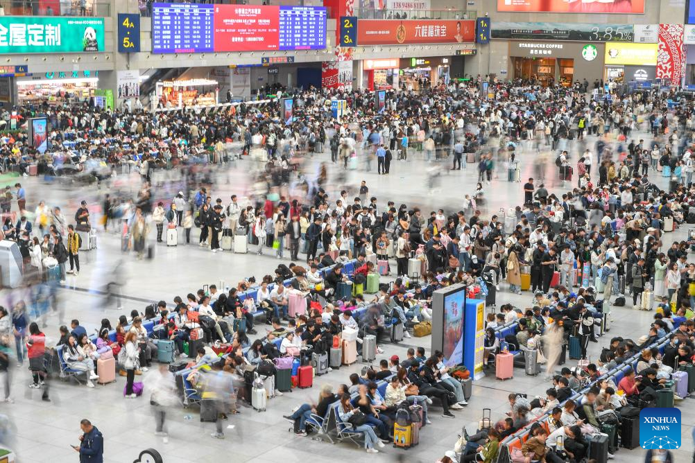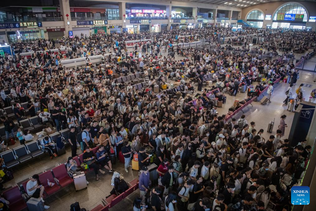 Passengers are seen at Wuhan Railway Station in Wuhan, central China's Hubei Province, Sept. 28, 2023. The Mid-Autumn Festival and National Day holiday period, which will last from Sept. 29 to Oct. 6 this year, is a peak travel and tourism season in China. (Photo by Du Zixuan/Xinhua)