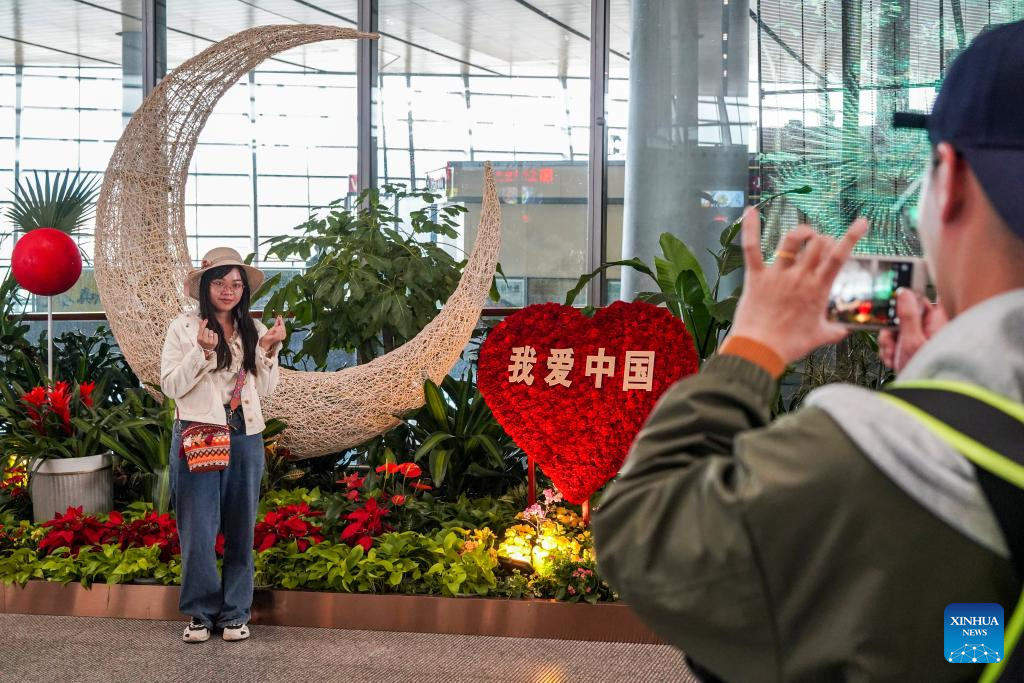 A passenger poses for photos in front of flower decorations at Kunming Changshui International Airport in Kunming, southwest China's Yunnan Province, Sept. 27, 2023. The Mid-Autumn Festival and National Day holiday period, which will last from Sept. 29 to Oct. 6 this year, is a peak travel and tourism season in China. (Xinhua/Cui Wen)