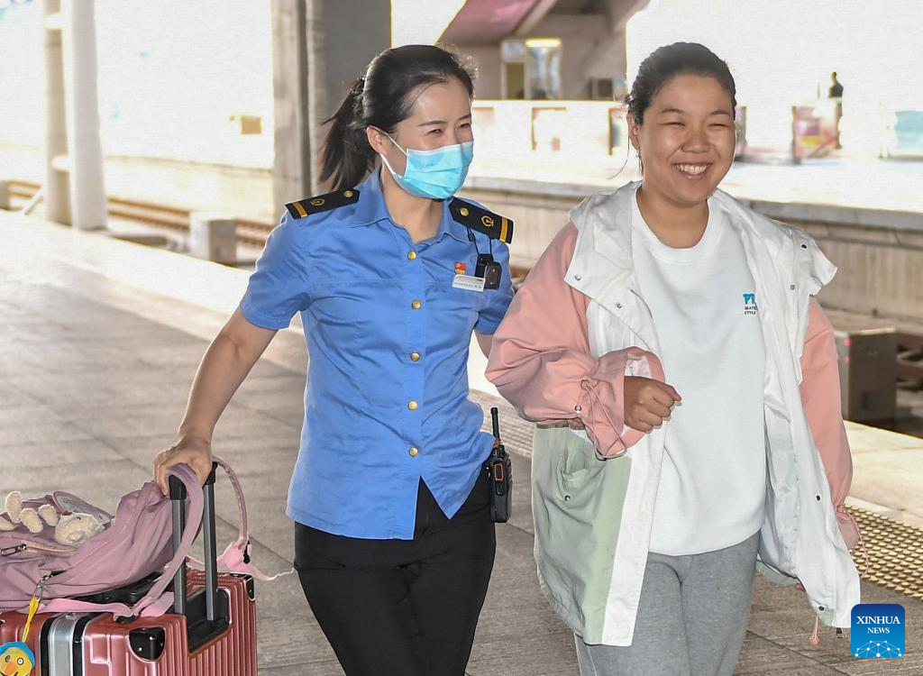 A staff member helps a visually impaired passenger at Changchun Railway Station in Changchun, northeast China's Jilin Province, Sept. 28, 2023. The Mid-Autumn Festival and National Day holiday period, which will last from Sept. 29 to Oct. 6 this year, is a peak travel and tourism season in China. (Xinhua/Zhang Nan)