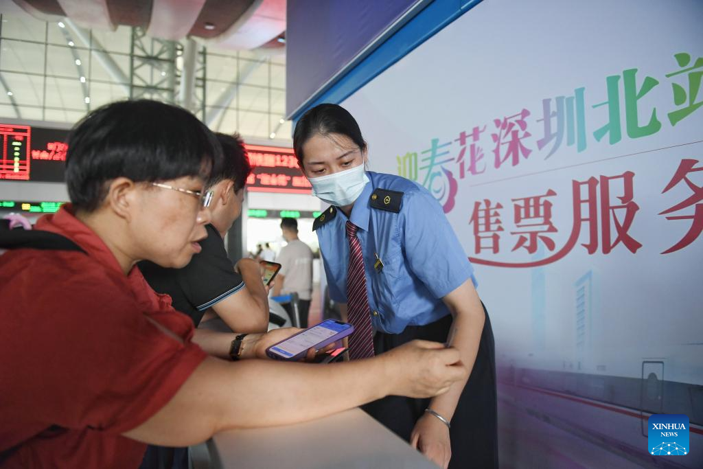 A staff member helps passengers at Shenzhen North Railway Station in Shenzhen, south China's Guangdong Province, Sept. 28, 2023. The Mid-Autumn Festival and National Day holiday period, which will last from Sept. 29 to Oct. 6 this year, is a peak travel and tourism season in China. (Xinhua/Mao Siqian)