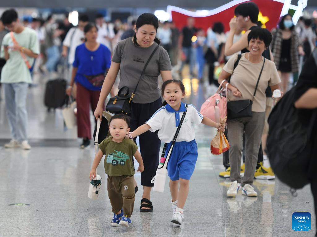 Passengers walk at Shenzhen North Railway Station in Shenzhen, south China's Guangdong Province, Sept. 28, 2023. The Mid-Autumn Festival and National Day holiday period, which will last from Sept. 29 to Oct. 6 this year, is a peak travel and tourism season in China. (Xinhua/Mao Siqian)