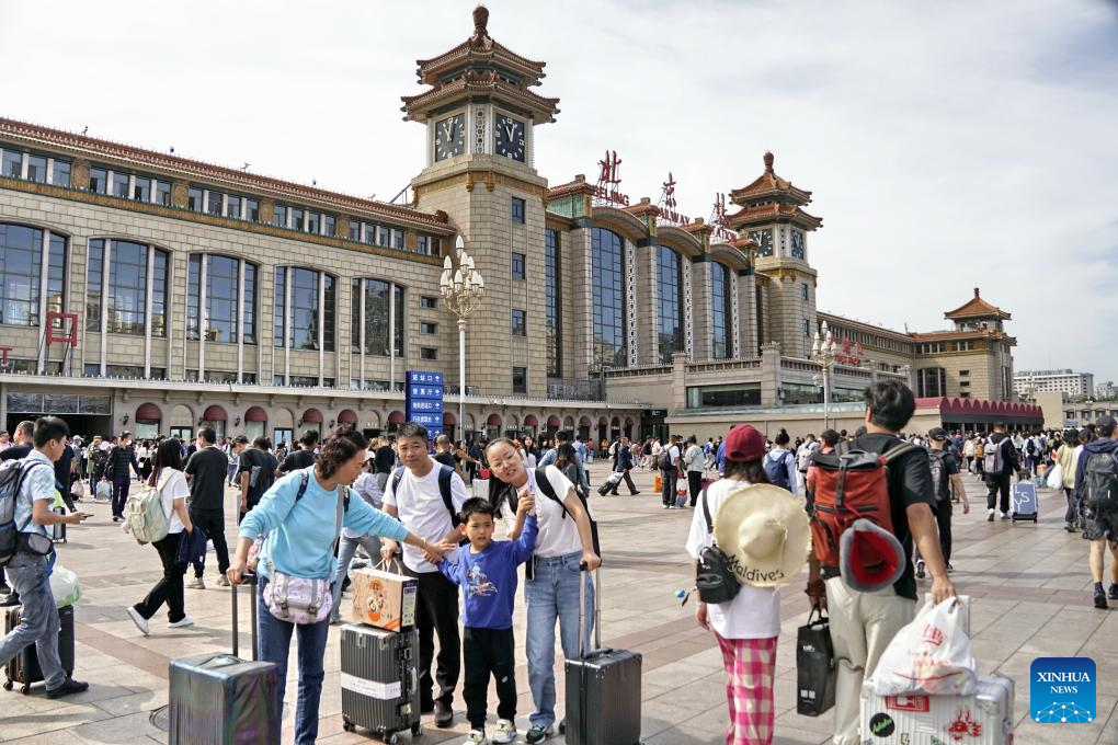 Passengers are seen at the square in front of Beijing Railway Station in Beijing, capital of China, Sept. 28, 2023. The Mid-Autumn Festival and National Day holiday period, which will last from Sept. 29 to Oct. 6 this year, is a peak travel and tourism season in China. (Xinhua/Li Xin)