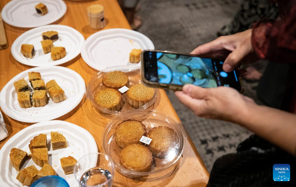 A woman takes photos of mooncakes during a Mid-Autumn Festival themed event at the China Cultural Center in Tel Aviv, Israel, Sept. 27, 2023. Various celebrations are held across the world with the approaching of Mid-Autumn Festival. (Xinhua/Chen Junqing)