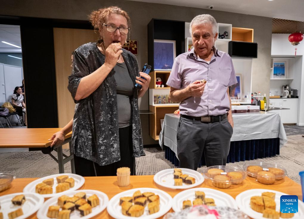 People taste mooncakes during a Mid-Autumn Festival themed event at the China Cultural Center in Tel Aviv, Israel, Sept. 27, 2023. Various celebrations are held across the world with the approaching of Mid-Autumn Festival. (Xinhua/Chen Junqing)