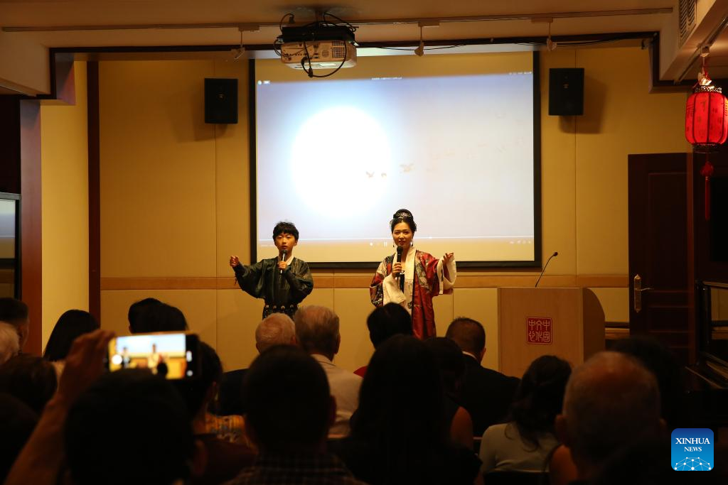 People recite a Chinese poem during a celebration of the Chinese Mid-Autumn Festival in Valletta, Malta, on Sept, 28, 2023. The China Cultural Center in Malta on Thursday evening hosted a vibrant celebration of the Chinese Mid-Autumn Festival, showcasing a delightful array of activities, including music, mooncake making and tasting, lantern crafting, and calligraphy. (Xinhua/Chen Wenxian)