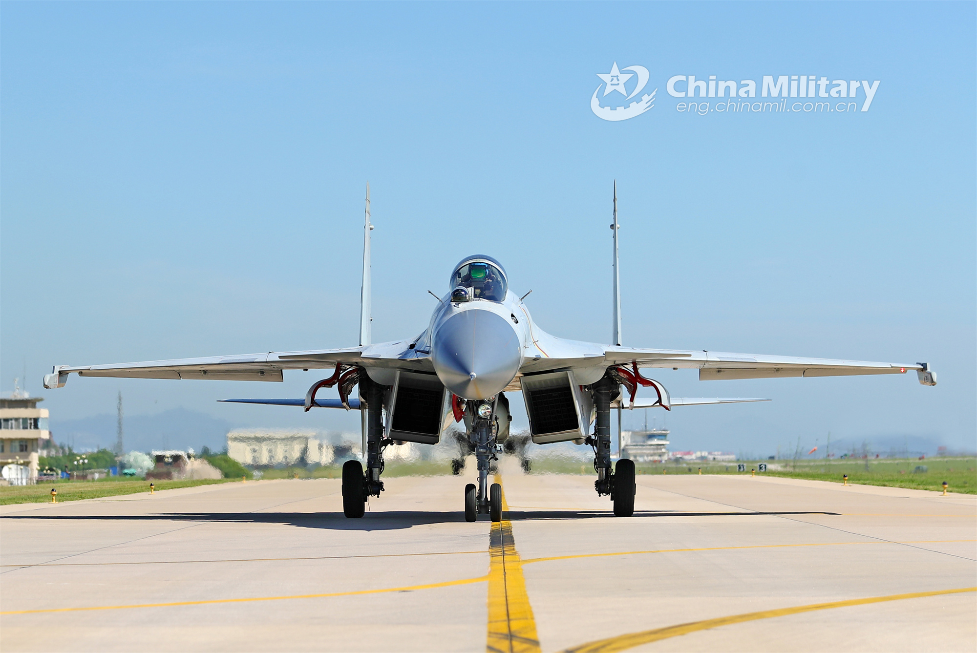 Fighter jets attached to the PLA Naval Aviation University taxi on the flightline in formation before takeoff for a flight training mission on September 16, 2023. (eng.chinamil.com.cn/Photo by Jiang Tao)