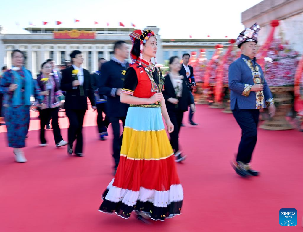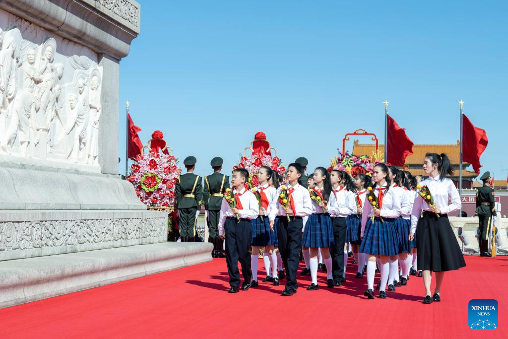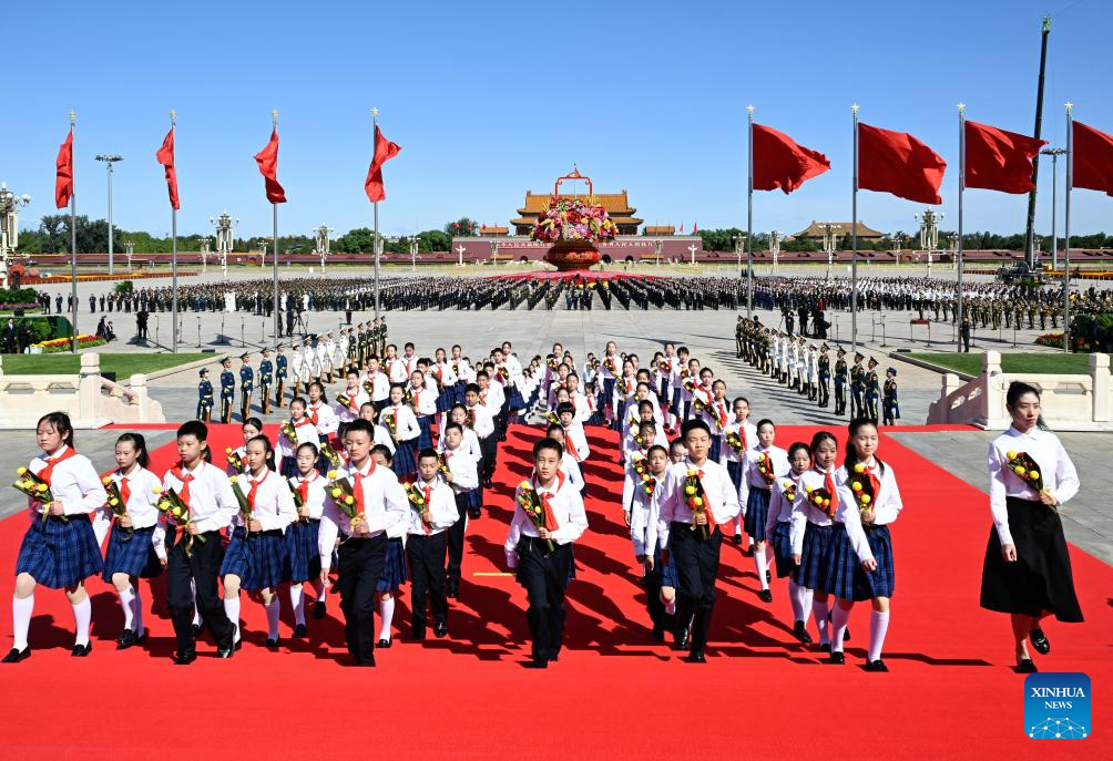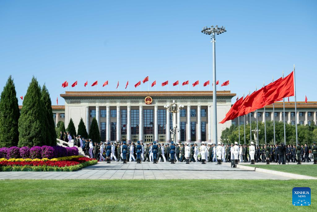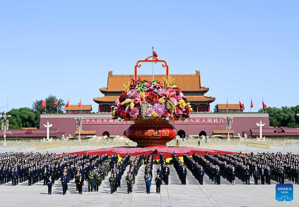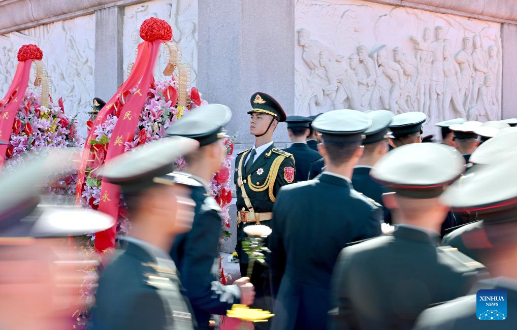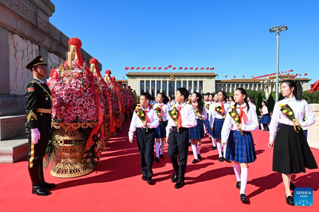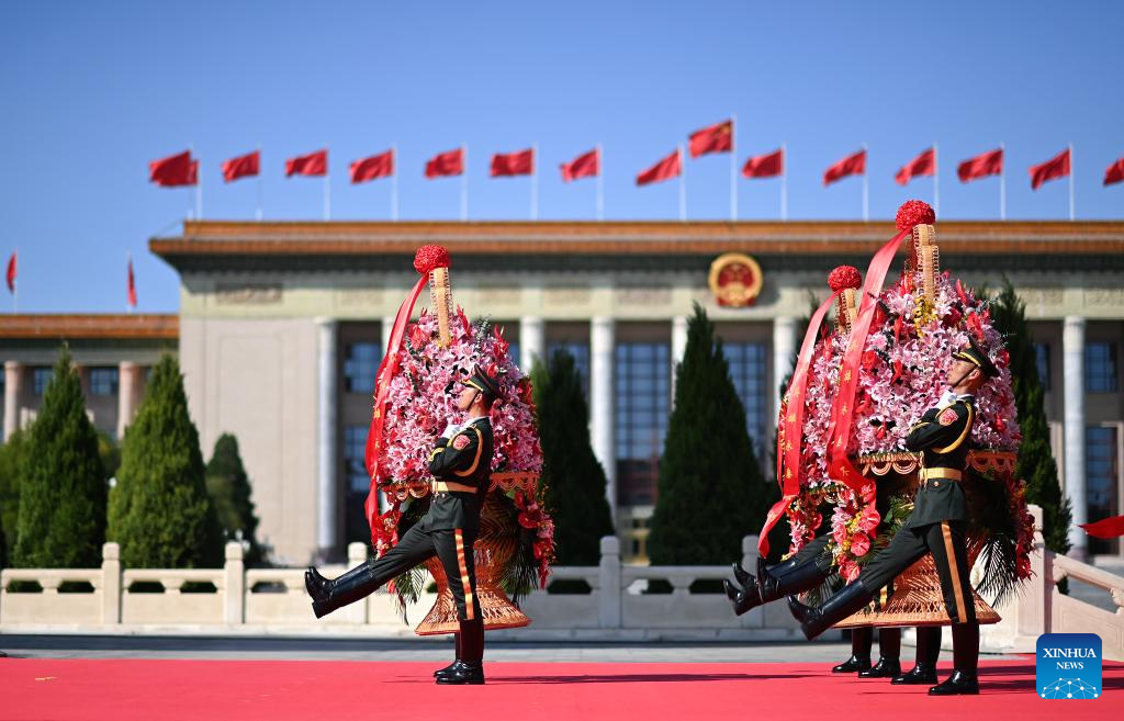 A ceremony presenting flower baskets to fallen national heroes to mark the Martyrs' Day is held in Tian'anmen Square in Beijing, capital of China, Sept. 30, 2023. (Xinhua/Zhai Jianlan)