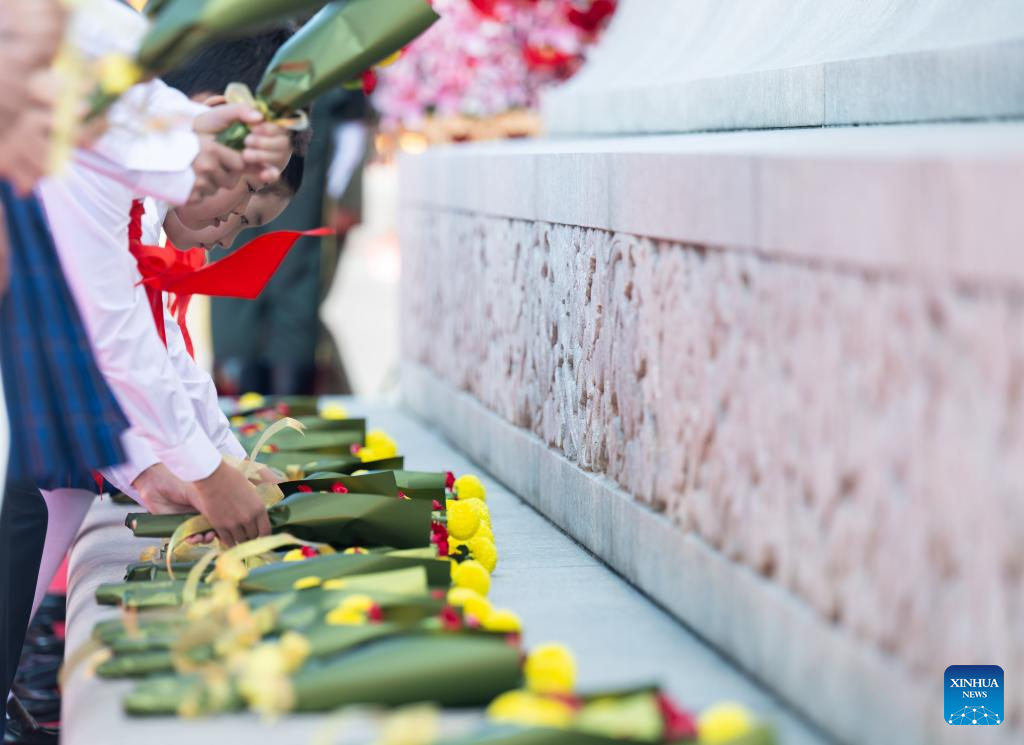 A ceremony presenting flower baskets to fallen national heroes to mark the Martyrs' Day is held in Tian'anmen Square in Beijing, capital of China, Sept. 30, 2023. (Xinhua/Yin Bogu)