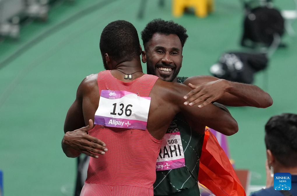 Yousef Ahmed M Masrahi (R) of Saudi Arabia hugs Abbas Yusuf Abbas Ali of Bahrain after the Men's 400m Final of Athletics at the 19th Asian Games in Hangzhou, east China's Zhejiang Province, Sept. 30, 2023. (Xinhua/Jiang Wenyao)