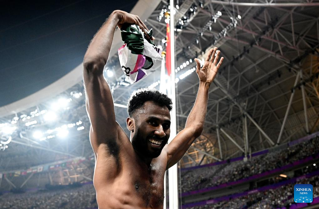 Yousef Ahmed M Masrahi of Saudi Arabia reacts after the Men's 400m Final of Athletics at the 19th Asian Games in Hangzhou, east China's Zhejiang Province, Sept. 30, 2023. (Xinhua/Song Yanhua)