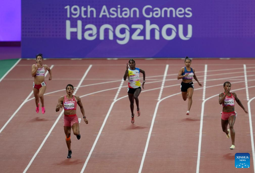 Oluwakemi Mujidat Adekoya(1st R) of Bahrain competes during the Women's 400m Final of Athletics at the 19th Asian Games in Hangzhou, east China's Zhejiang Province, Sept. 30, 2023. (Xinhua/Sun Fei)