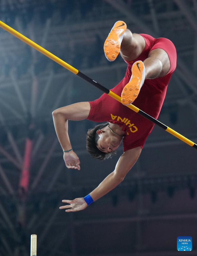Huang Bokai of China competes during the Men's Pole Vault of Athletics at the 19th Asian Games in Hangzhou, east China's Zhejiang Province, Sept. 30, 2023. (Xinhua/Li Yibo)