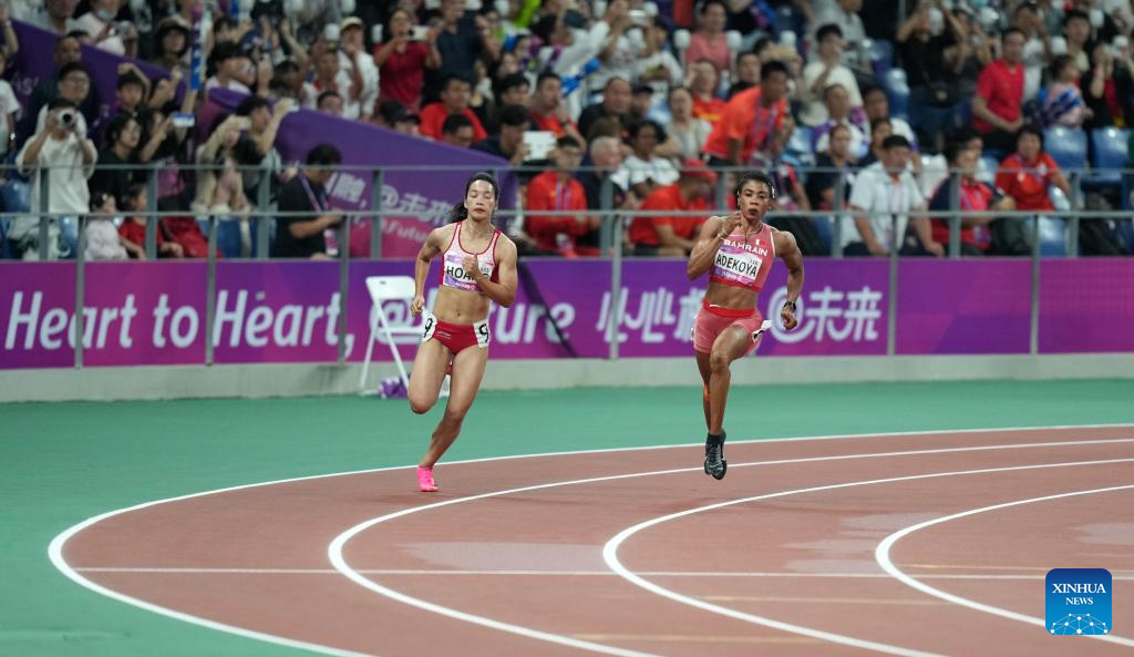Oluwakemi Mujidat Adekoya(R) of Bahrain and Hoang Thi Minh Hanh of Vietnam compete during the Women's 400m Final of Athletics at the 19th Asian Games in Hangzhou, east China's Zhejiang Province, Sept. 30, 2023. (Xinhua/Sun Fei)
