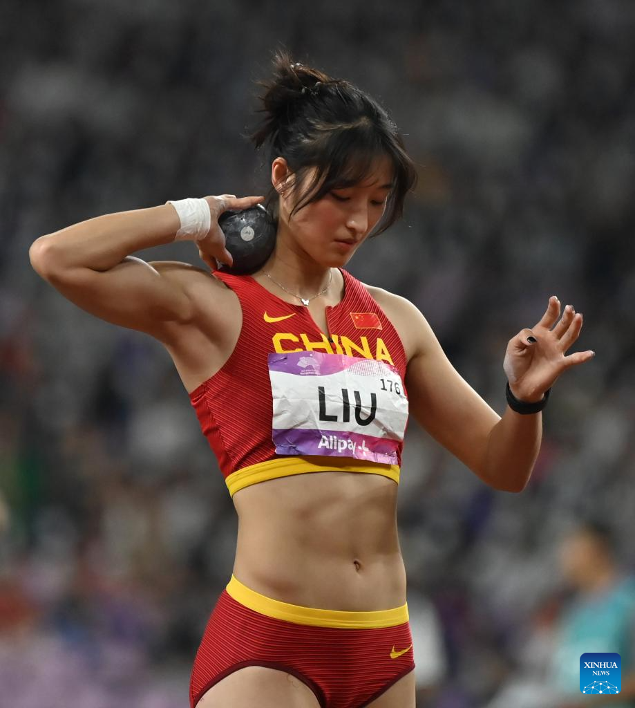 Liu Jingyi of China competes during the Women's Heptathlon Shot Put of Athletics at the 19th Asian Games in Hangzhou, east China's Zhejiang Province, Sept. 30, 2023. (Xinhua/Jiang Han)