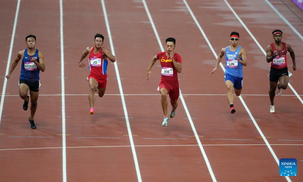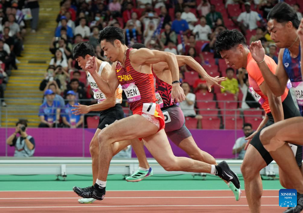Xie Zhenye (C) of China competes during the Men's 100m Semifinal of Athletics at the 19th Asian Games in Hangzhou, east China's Zhejiang Province, Sept. 30, 2023. (Xinhua/Jiang Wenyao)