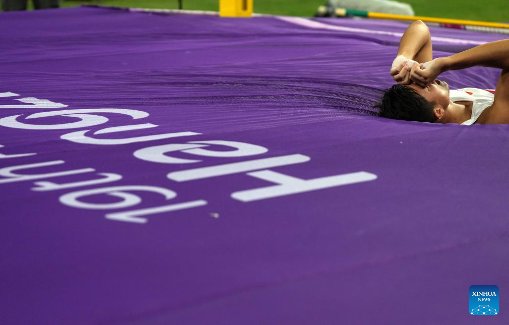 Ernest John Obiena of the Philippines reacts during the Men's Pole Vault of Athletics at the 19th Asian Games in Hangzhou, east China's Zhejiang Province, Sept. 30, 2023. (Xinhua/Li Yibo)