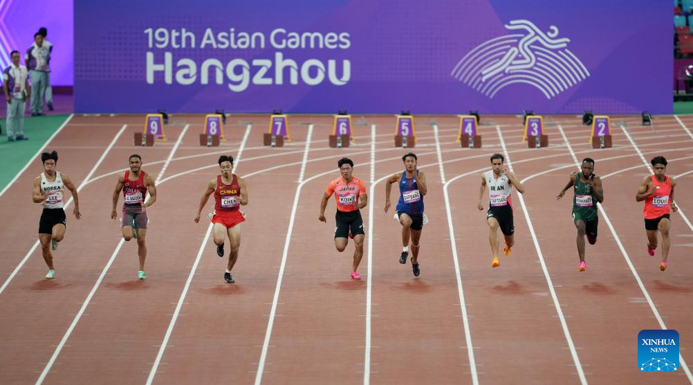Athletes compete during the Men's 100m Semifinal of Athletics at the 19th Asian Games in Hangzhou, east China's Zhejiang Province, Sept. 30, 2023. (Xinhua/Sun Fei)
