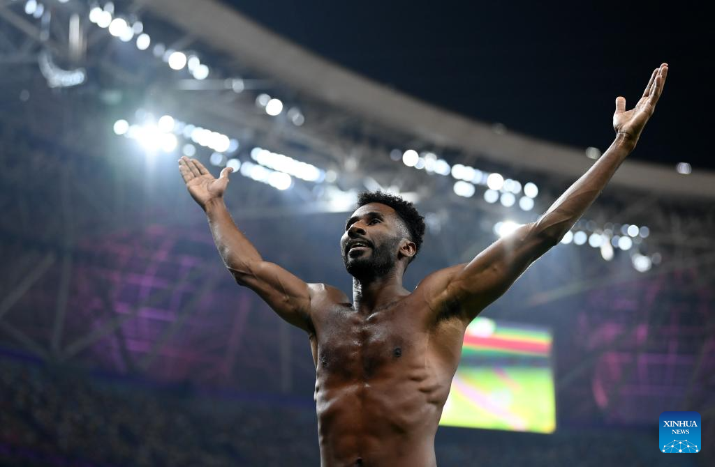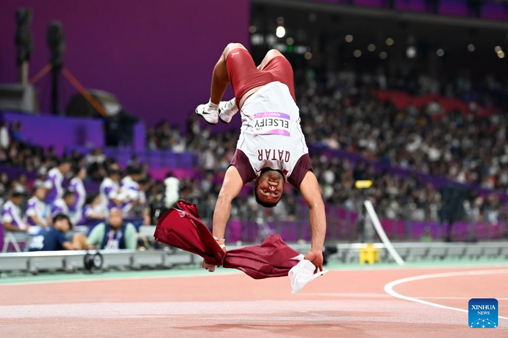 Ashraf Elseify of Qatar reacts after the Men's Hammer Throw Final of Athletics at the 19th Asian Games in Hangzhou, east China's Zhejiang Province, Sept. 30, 2023. (Xinhua/Jiang Han)