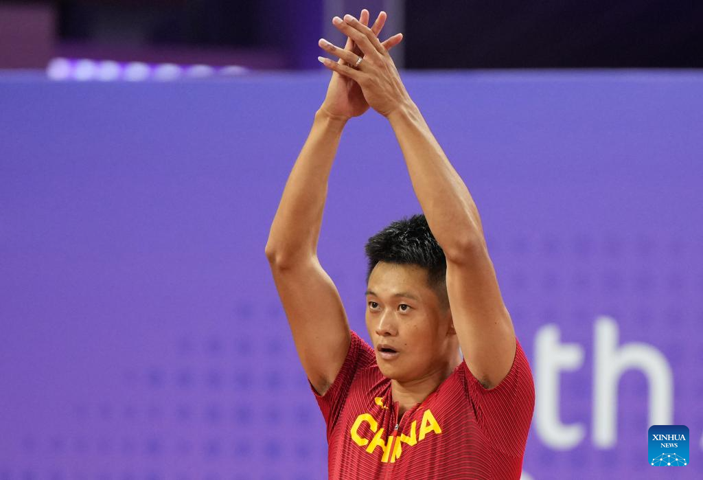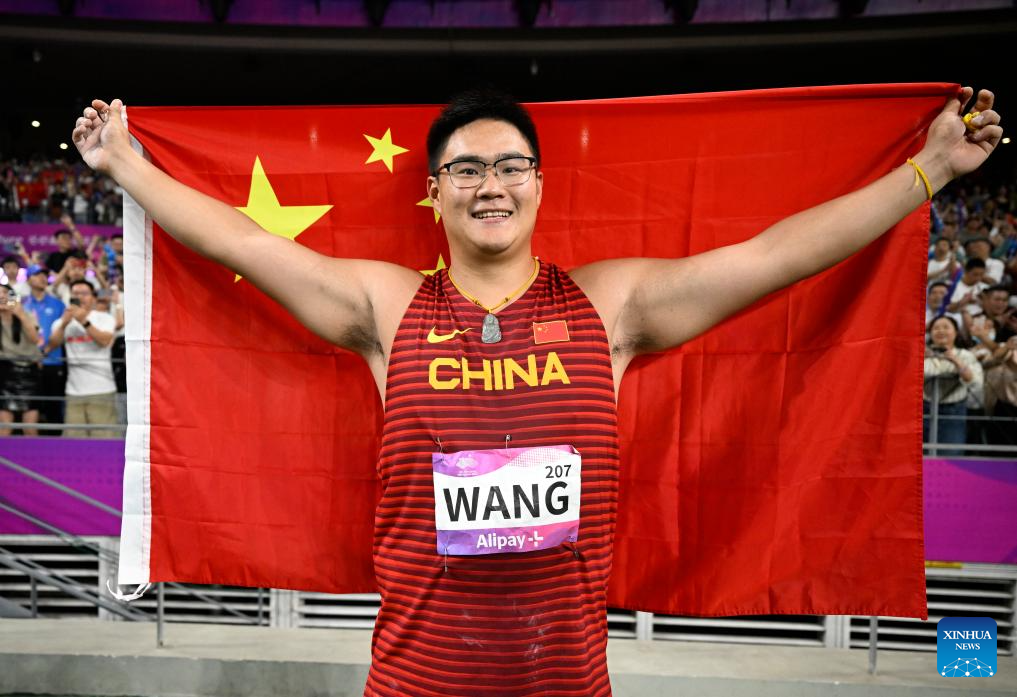 Wang Qi of China celebrates after the Men's Hammer Throw Final of Athletics at the 19th Asian Games in Hangzhou, east China's Zhejiang Province, Sept. 30, 2023. (Xinhua/Song Yanhua)