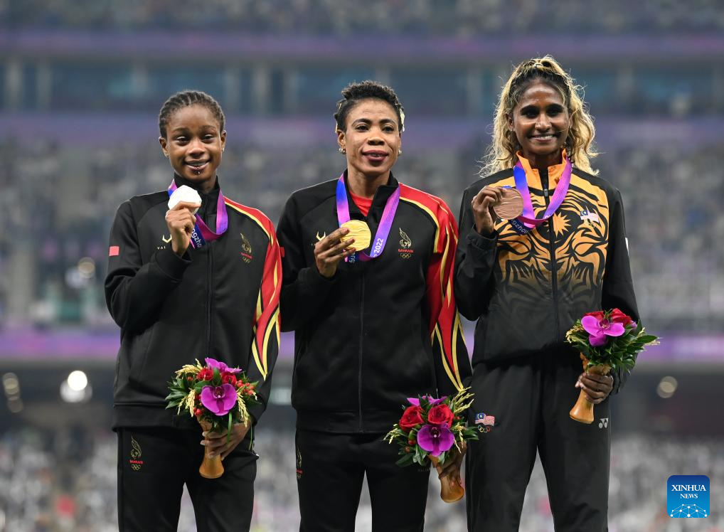 Gold medalist Oluwakemi Mujidat Adekoya(C) of Bahrain, silver medalist Salwa Eid Naser Naser(L) of Bahrain and bronze medalist Vallabouy Shereen Samson of Malaysia attend the victory ceremony for the Women's 400m Final of Athletics at the 19th Asian Games in Hangzhou, east China's Zhejiang Province, Sept. 30, 2023. (Xinhua/Jiang Han)