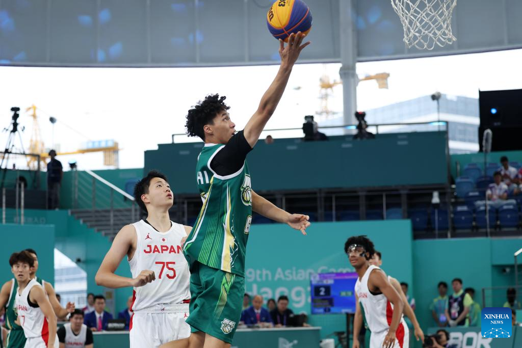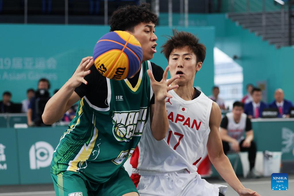 Ho Hou In of China's Macao competes during Men's Qualifications to Quarterfinal of 3X3 Basketball between Japan and China's Macao at the 19th Asian Games in Huzhou, east China's Zhejiang Province, Sept. 30, 2023. (Xinhua/Chen Bin)