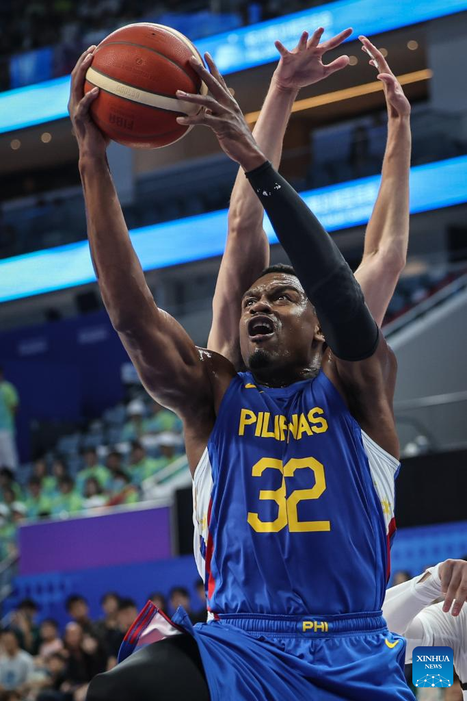 Justin Brownlee (C) of Philippines competes during the Men's Preliminary Round Group match of Basketball between Jordan and Philippines at the 19th Asian Games in Hangzhou, east China's Zhejiang Province, Sept. 30, 2023. (Xinhua/Pan Yulong)