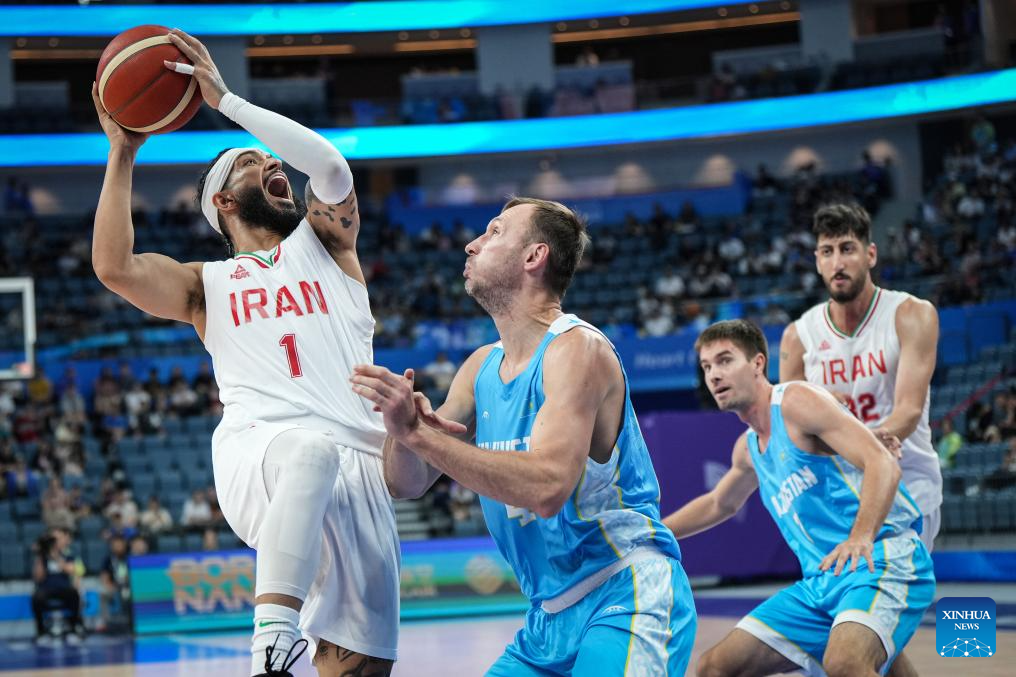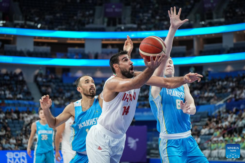 Arsalan Kazemi Naeini (2nd R) of Iran competes during the Men's Preliminary Round Group match of Basketball between Iran and Kazakhstan at the 19th Asian Games in Hangzhou, east China's Zhejiang Province, Sept. 30, 2023. (Xinhua/Pan Yulong)