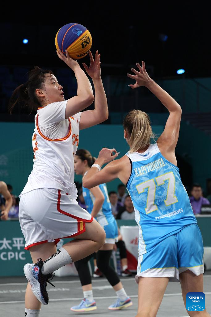 Wang Xinyu (L) of China competes during Women's U23 Quarterfinal of 3X3 Basketball between Kazakhstan and China at the 19th Asian Games in Huzhou, east China's Zhejiang Province, Sept. 30, 2023. (Xinhua/Chen Bin)