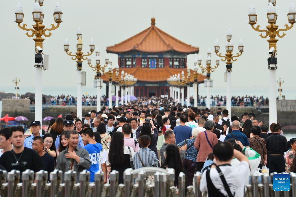 People visit the Zhanqiao bridge scenic spot in Qingdao, east China's Shandong Province, Sept. 29, 2023. Friday marks the traditional Mid-Autumn Festival this year in China, which is celebrated in diverse ways, ranging from family reunions with big feasts to public gatherings featuring traditional ceremonies, performances and Mid-Autumn gala. (Photo by Wang Haibin/Xinhua)
