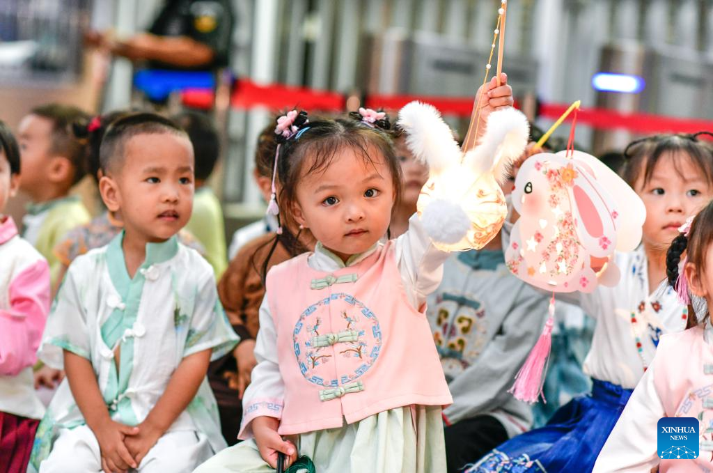 Children participate in an activity to celebrate the Mid-Autumn Festival at a kindergarten in Guiyang, southwest China's Guizhou Province, Sept. 28, 2023. Friday marks the traditional Mid-Autumn Festival this year in China, which is celebrated in diverse ways, ranging from family reunions with big feasts to public gatherings featuring traditional ceremonies, performances and Mid-Autumn gala. (Xinhua/Yang Wenbin)
