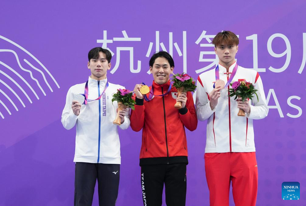 Gold Medalist Honda Tomoru (C) of Japan, Silver Medalist Wang Kuan-hung (L) of Chinese Taipei and Bronze Medalist Chen Juner of China attend the awarding ceremony for Men's 200m Butterfly of Swimming at the 19th Asian Games in Hangzhou, east China's Zhejiang Province, Sept. 29, 2023. (Xinhua/Du yu)
