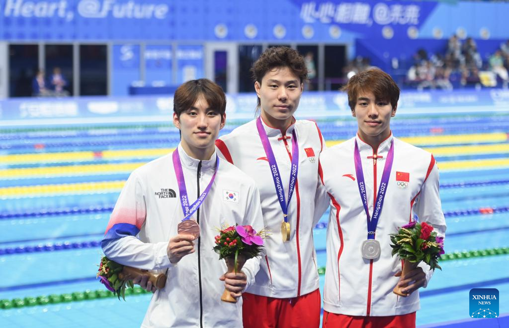 Gold Medalist (C) Qin Haiyang of China, Silver Medalist Sun Jiajun (R) of China and Bronze Medalist Choi Dongyeol of South Korea pose after the awarding ceremony for Men's 50m Breaststroke of Swimming at the 19th Asian Games in Hangzhou, east China's Zhejiang Province, Sept. 29, 2023. (Xinhua/Huang Zongzhi)
