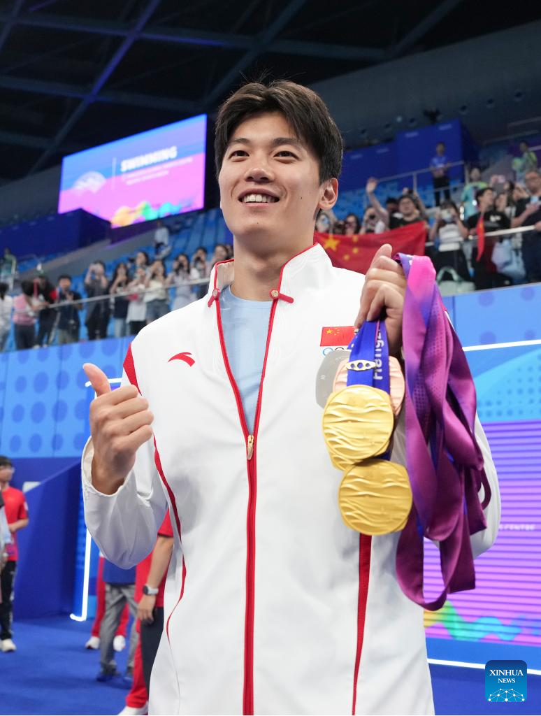 Wang Shun of China poses with gold medals after Swimming contests at the 19th Asian Games in Hangzhou, east China's Zhejiang Province, Sept. 29, 2023. (Xinhua/Du yu)