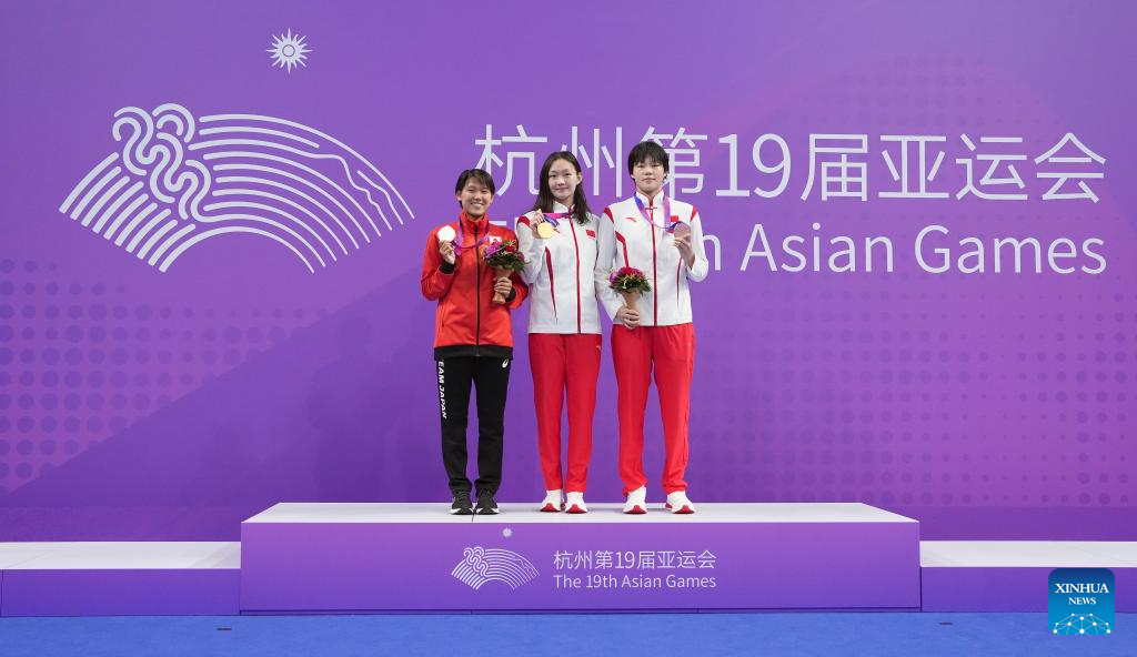 Gold Medalist Li Bingjie (C) of China, Silver Medalist Kobori Waka (L) of Japan and Bronze Medalist Yang Peiqi of China attend the awarding ceremony for Women's 800m Freestyle of Swimming at the 19th Asian Games in Hangzhou, east China's Zhejiang Province, Sept. 29, 2023. (Xinhua/Du yu)
