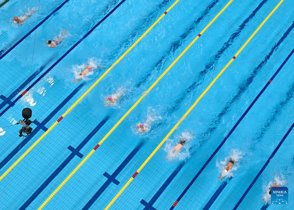 Yu Yiting (4th L) of China, Zhang Yufei (4th R) of China and Ikee Rikako (3rd R) of Japan compete during the Women's 50m Butterfly Final of Swimming at the 19th Asian Games in Hangzhou, east China's Zhejiang Province, Sept. 29, 2023. (Xinhua/Xia Yifang)