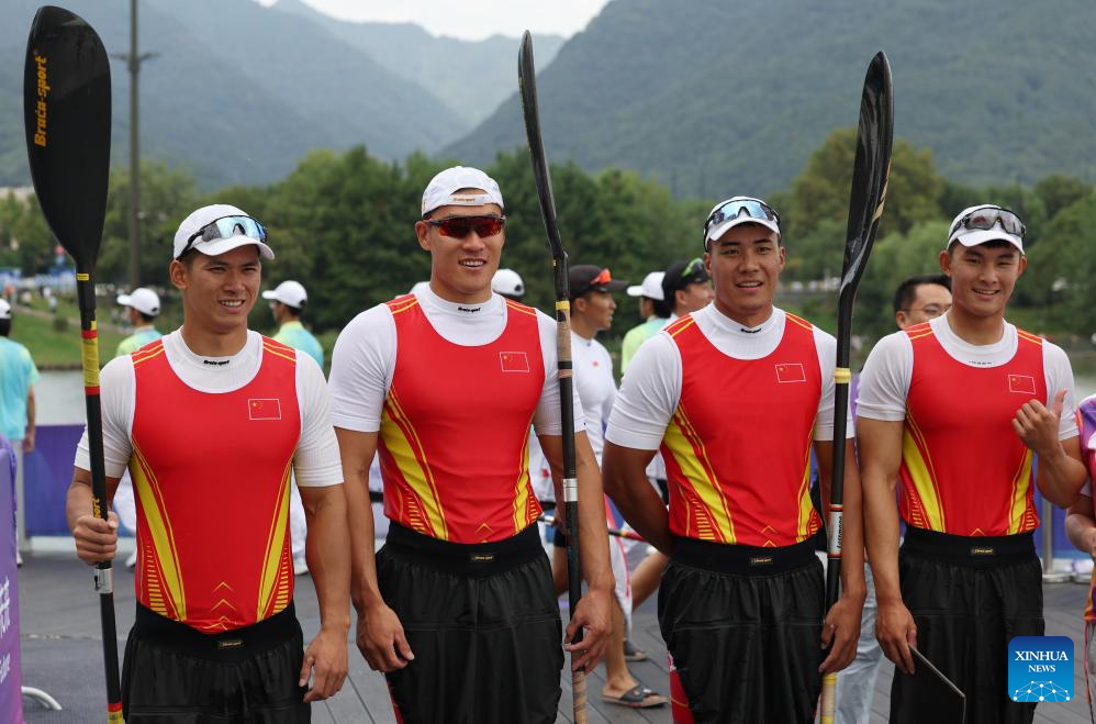 Team China pose for photos after the Men's Kayak Four 500m Heat of Canoe Sprint at the 19th Asian Games in Hangzhou, east China's Zhejiang Province, Oct. 1, 2023. (Xinhua/Du Xiaoyi)