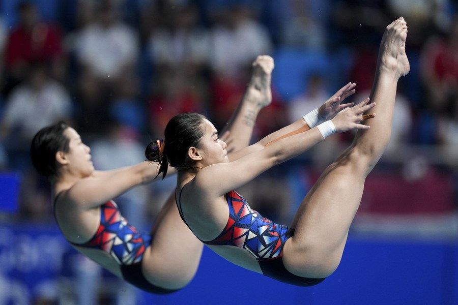 Ng Yan Yee (L)/Nur Dhabitah Sabri of Malaysia compete in the women's 3m springboard synchro final. (Xinhua/Du Yu)