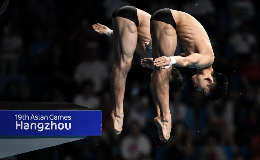 Yang Hao (front)/Lian Junjie of China compete in the men's 10m platform synchro final at the Hangzhou Asian Games on Oct. 1, 2023. (Xinhua/Xia Yifang)