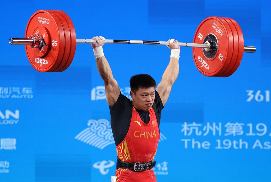 Shen Lijun, men's 67kg gold medalist at the Tokyo Olympics, grabbed gold in the category at the Asiad, lifting 150kg in the snatch and 180kg in the clean and jerk for a total of 330kg.