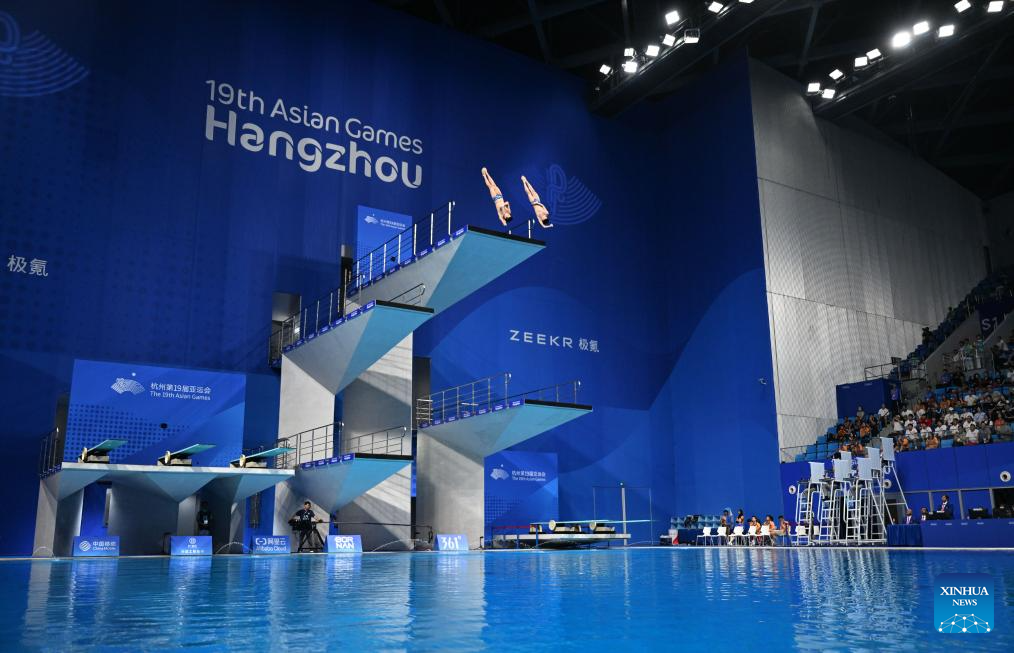 HANGZHOU, Oct. 1 (Xinhua) -- China continued their dominance in the diving competition of the Hangzhou Asian Games, adding two synchro titles on Sunday.
