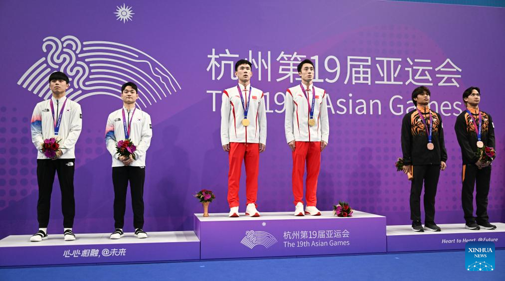 Gold medalists Yang Hao/Lian Junjie (C) of China, silver medalists Yi Jaegyeong/Kim Yeongnam(L) of South Korea and bronze medalists Bertrand Rhodict Anak Lises/Enrique Maccartney Anak Harold of Malaysia attend the awarding ceremony for Men's Synchronised 10m Platform of Diving at the 19th Asian Games in Hangzhou, east China's Zhejiang Province,Oct. 1, 2023. (Xinhua/Xia Yifang)