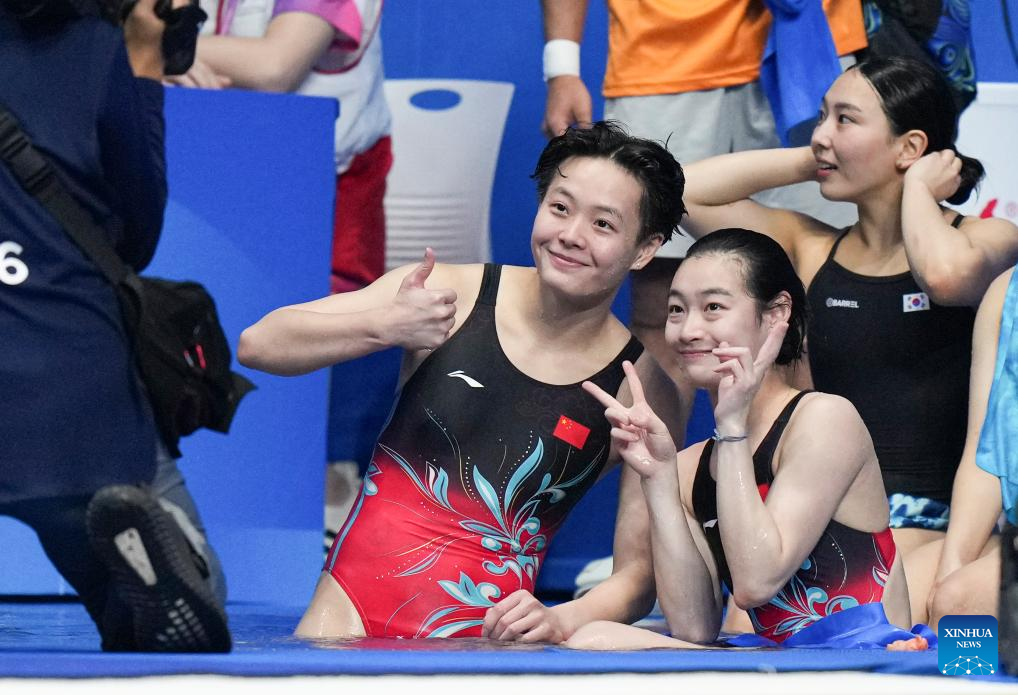 Chen Yiwen (L)/Chang Yani of China pose for photos after the Women's Synchronised 3m Springboard Final of Diving at the 19th Asian Games in Hangzhou, east China's Zhejiang Province, Oct. 1, 2023. (Xinhua/Du yu)