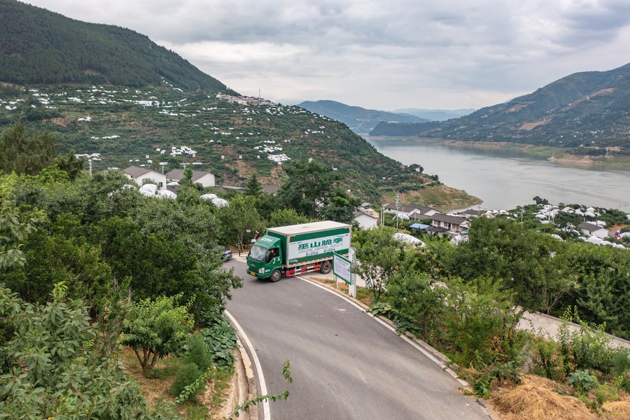 This aerial photo taken on June 28, 2023 shows a truck loaded with crisp plums moving at Ganyuan Village of Wushan County, southwest China's Chongqing. (Xinhua/Huang Wei)