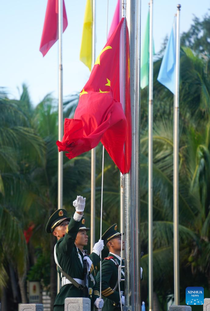 A flag-raising ceremony to celebrate the 74th anniversary of the founding of the People's Republic of China is held on Yongxing Island of Sansha City, south China's Hainan Province, Oct. 1, 2023. (Xinhua/Fan Yuqing)